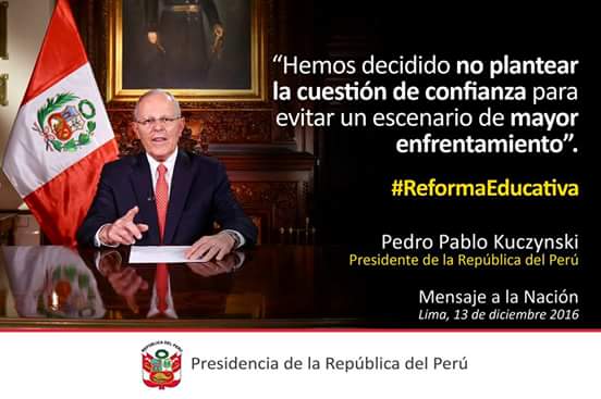En su mensaje a la Nación, el presidente de la República Pedro Pablo Kuczynski; ha confirmado que no planteará la cuestión de confianza por la censura del ministro Jaime Saavedra y con esto abandona toda posibilidad de presionar a la bancada fuimorista, para que esta desista de tachar al titular del sector educación.