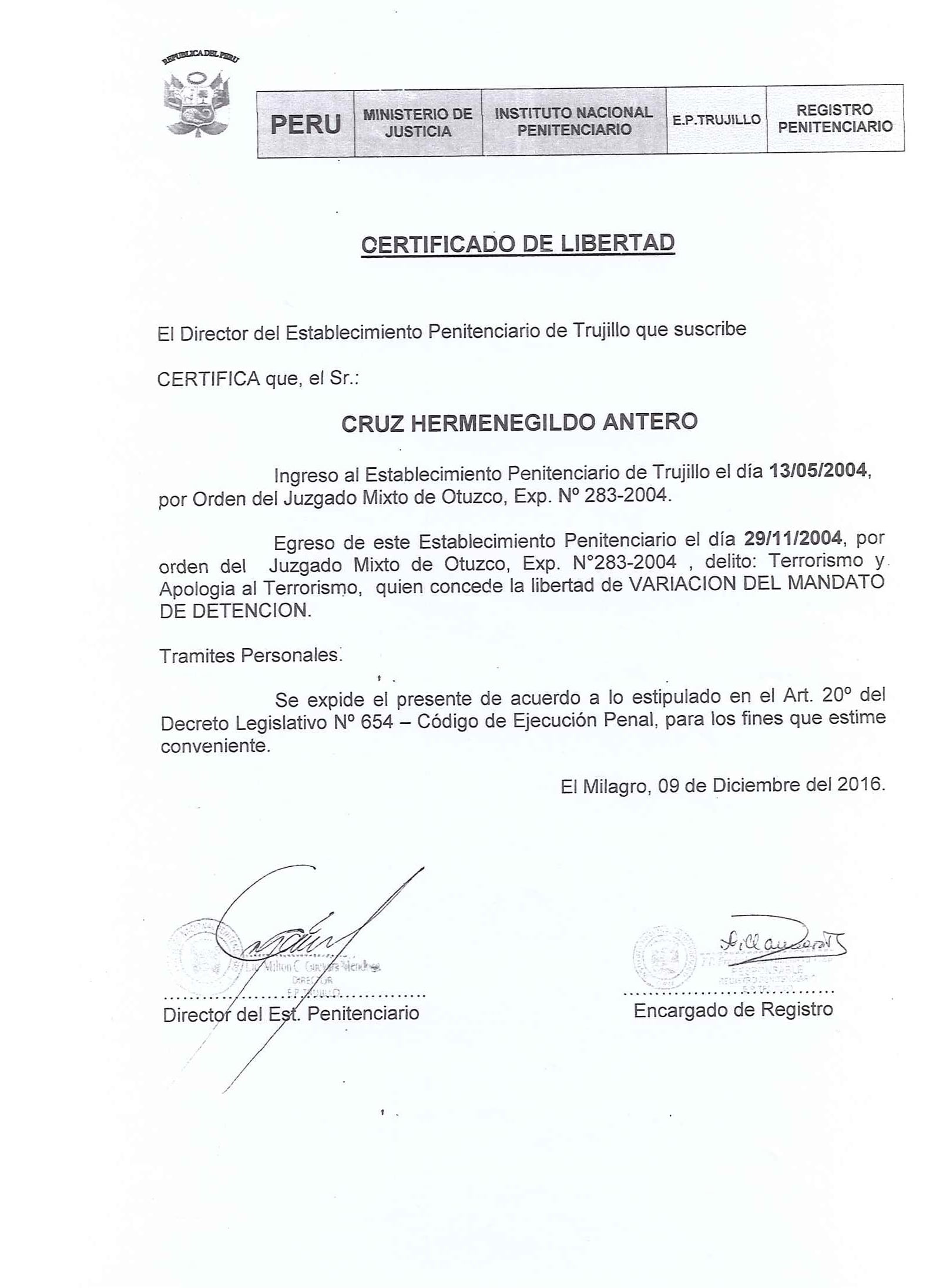 Antero Cruz Hermeregildo subprefecto de la provincia de Otuzco, estuvo en la cárcel por el delito de terrorismo y apología al terrorismo; tal como lo demuestra este certificado de libertad que indica que el mencionado personaje ingresó al penal el Milagro el 13 de mayo del año 2004.