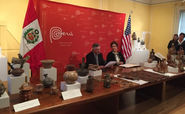 El Perú y Estados Unidos tienen en vigor un memorándum de entendimiento firmado hace veinte años, restringiendo la importación de material arqueológico de las culturas prehispánicas, así como de material etnológico perteneciente al período colonial peruano.
