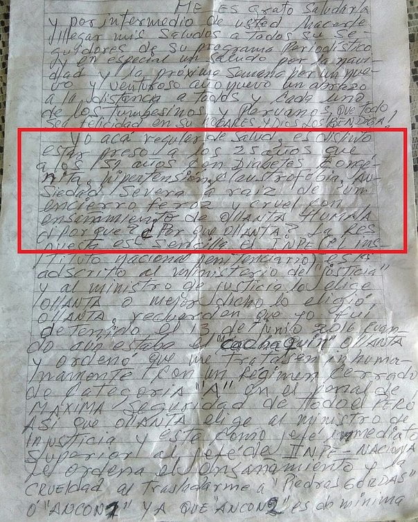 En las cuatro carillas de la carta la exautoridad sigue aclamando su inocencia y alega ser un perseguido del expresidente del Perú. Como se sabe Gerardo Viñas fue condenado a 11 años por colusión agravada.