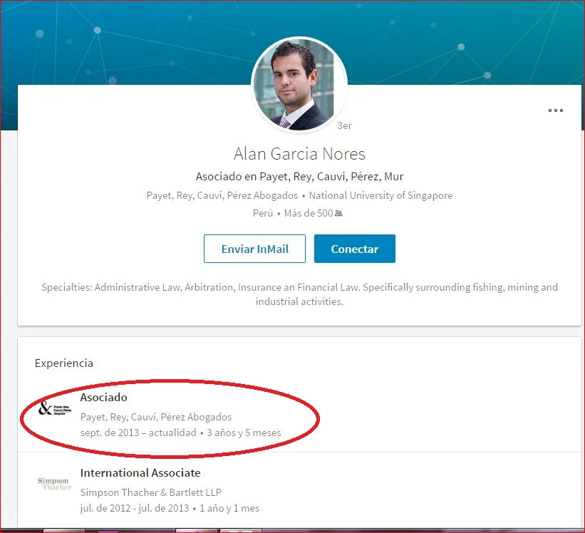 Por ahora solo nos vamos a centrar en el estudio Antonio Payet, Alonso Rey & Juan Cauvi Abogados, este estudio tiene entre sus asociados al hijo del expresidente Alan García. Esta información que ha pasado desapercibida es fácil de corrobar. Alan García Nores, en su cuenta de la red social laboral Linkedin; ha dado cuenta de toda su experiencia laboral.