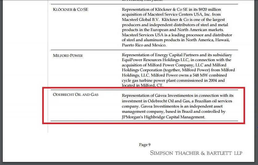 Esta firma que tiene su sede principal en New York también representó a una subsidiaria de la cuestionada constructora, en este caso a Odebrecht Oil y Gas, con sede en Brasil. Macronorte accedió a esta información consignada en una lista de asesorías exitosas elaborada por Simpson Thacher & Bartlett LLP.