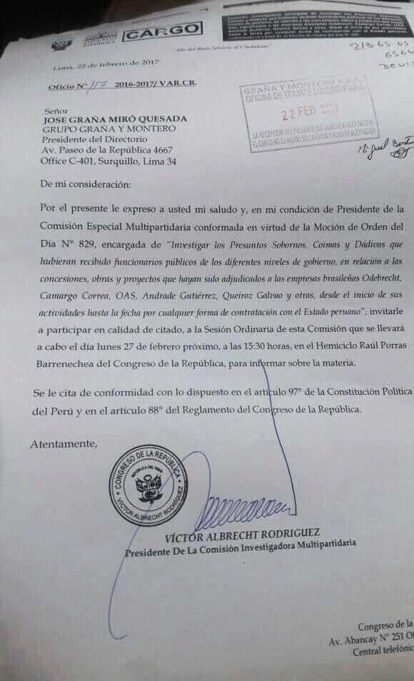 El presidente del Directorio del Grupo Graña y Montero, José Graña Miro Quesada, fue citado ante la Comisión Lava Jato para el lunes 27 de febrero a las 03:30 de la tarde, según se lee en una misiva emitida por el presidente de dicho grupo de trabajo, Victor Albrecht.