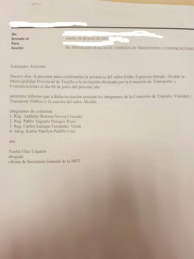 La autoridad edil debe presentarse a las 10 de la mañana ante la citada Comisión sin embargo no lo hará solo, Macronorte pudo confirmar que los integrantes de la Comisión de Transportes de la Municipalidad de Trujillo, Carlos Fernández Verde, Pablo Penagos Ruzo y Anthony Novoa (presidente) también tendrán que acudir a esta citación.