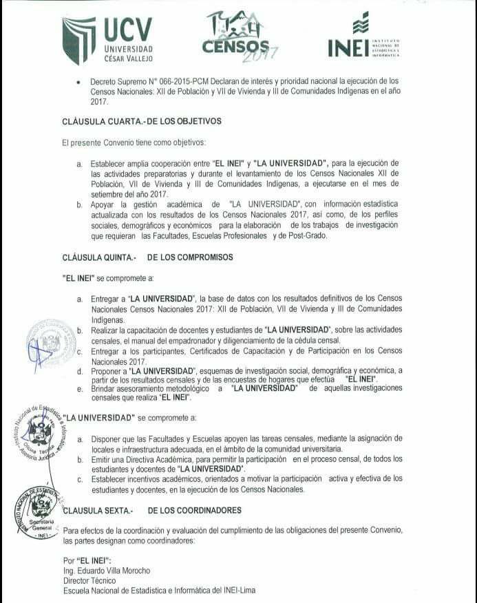 El 01 de marzo de 2017, el INEI y la Universidad César Vallejo firmaron un convenio de cooperación interinstitucional en apoyo a los Censos Nacionales 2017. Por el lado de la UCV los compromisos fueron disponer que las facultades y escuelas apoyen las tareas censales, mediante la asignación de locales e infraestructura adecuada, además a establecer incentivos académicos, orientados a motivar la participación activa y efectiva de los estudiantes y docentes en la ejecución de los censos.
