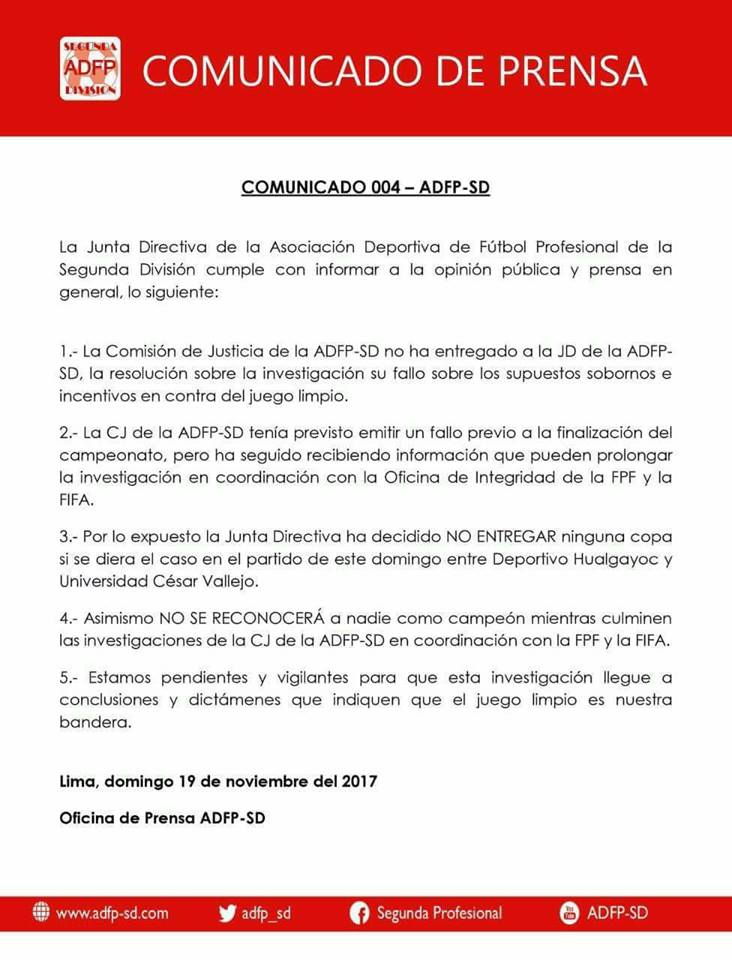 Mientras el partido se jugaba la ADFP-SD emitió un comunicado donde explica que no habrá un campeón del torneo hasta que no acaben las investigaciones por los supuestos casos de soborno que involucran al cuadro de la Vallejo.