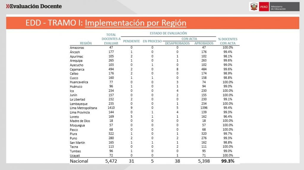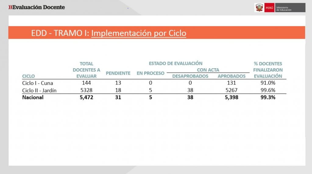 De acuerdo con los resultados consolidados de este pilar de la Ley de la Carrera Pública Magisterial, de los 5472 docentes convocados, el 99,3% rindió la evaluación y, de este grupo, 5398 profesores fueron aprobados, es decir, el 99,7%.