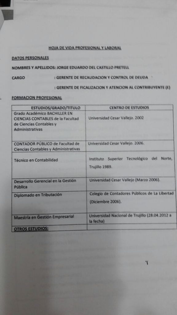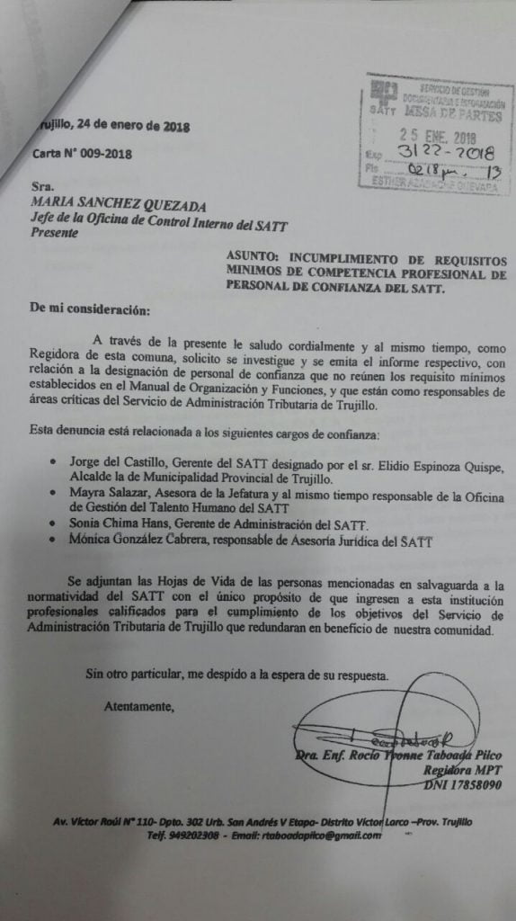 El documento en cuestión fue elaborado en respuesta a la denuncia interpuesta por la regidora Rocío Taboada, quien sostuvo que la gran mayoría de los funcionarios de confianza del alcalde Elidio Espinoza no están preparados técnicamente para ocupar sus cargos y esto redunda en el atraso de la ciudad.