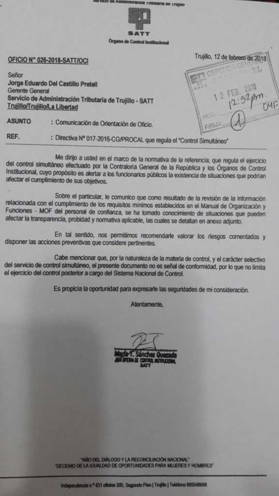 El Órgano de Control Interno (OCI) de la Municipalidad de Trujillo confirmó que el gerente del SATT y otros funcionarios de este organismo fueron contratados sin cumplir con los requisitos mínimos para el cargo establecidos en el manual de organización y funciones.