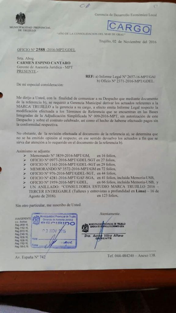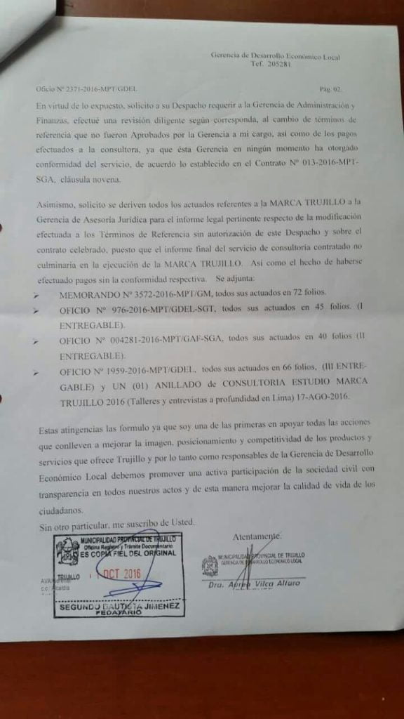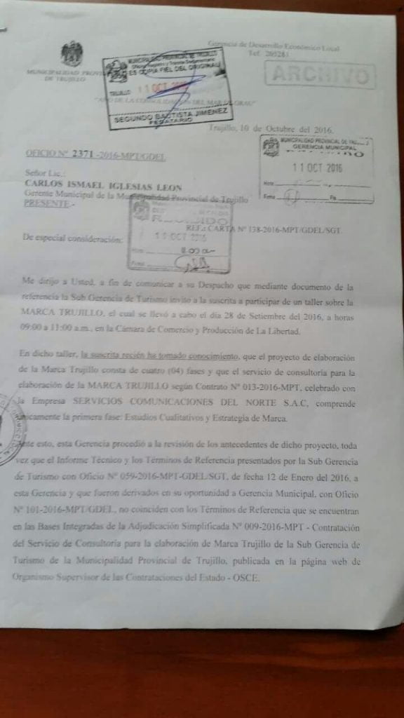 Este portal accedió a documentos de la Gerencia de Desarrollo Económico Local del año 2016, donde se ponen en cuestionamiento la contratación de la empresa del publicista Fernando Arancibia, Servicios Comunicaciones del Norte (Hub 051+), para la elaboración de la Marca Trujillo.
