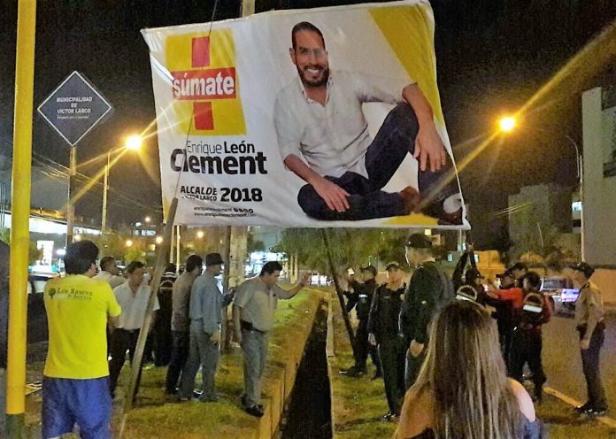 Según la subgerente de Fiscalización y Control, Cynthia Tafur, señaló que dicho panel publicitario con la publicidad, en la que el administrado se anuncia como postulante en las próximas elecciones municipales, fue retirado anoche por personal de la Municipalidad de Víctor Larco haciendo cumplir la ordenanza N°7-2013-MDVLH y la ley N°26664, dado que no sólo carecía de autorización municipal sino también constituye daño a las áreas verdes públicas por lo que se ha notificado la infracción en su domicilio a León Clement con anticipación al acto de retiro.
