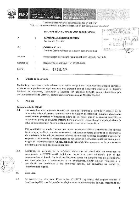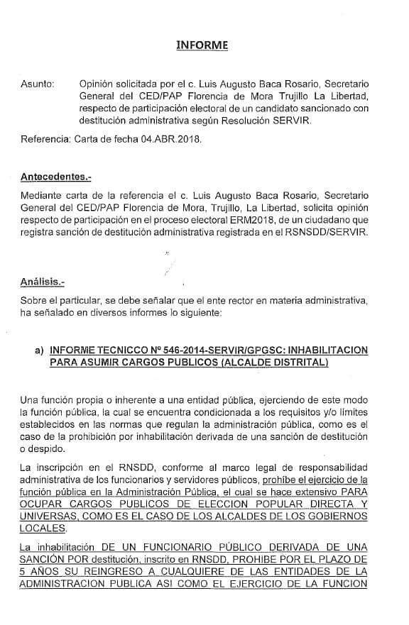 El informe de Pimentel aliaga, se produce en respuesta a la consulta del secretario distrital del Apra en Florencia de Mora, sobre la situación de uno de los pre candidatos que están inhabilitados por la Contraloría y ha sido incluido en la lista de sancionados de SERVIR.