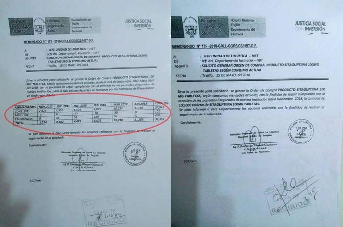 Resulta extremadamente sospechoso que el memorándum N° 175 -2018-GRLL-GGRS/GS/HBT-D.F. que presentaba la tabla con el consumo real desde noviembre del año pasado hasta abril de este año, y que desbarataba una supuesta demanda de 20 mil tabletas al mes, fue reemplazado por un documento de igual numeración, pero que esta vez no consigna la incómoda tabla referencial formulada por los encargados de la farmacia del Hospital Belén. ¿A quién le convenía que se siga con la compra «inflada» de sitagliptina?.