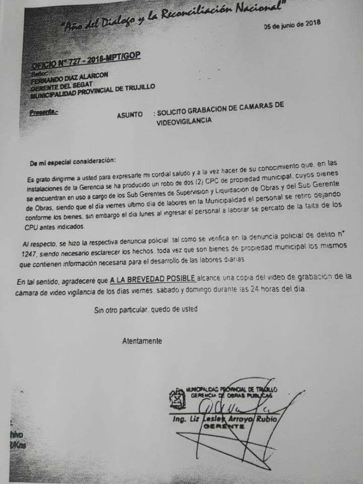 La gerente de obras publicas de la Municipalidad Provincial de Trujillo denunció el robo de dos computadoras de la Sub Gerencia de Supervisión y Liquidaciones y de la Sub Gerencia de Obras Públicas, ambas contenían información clave de las obras que ha ejecutado la gestión del alcalde Elidio Espinoza.
