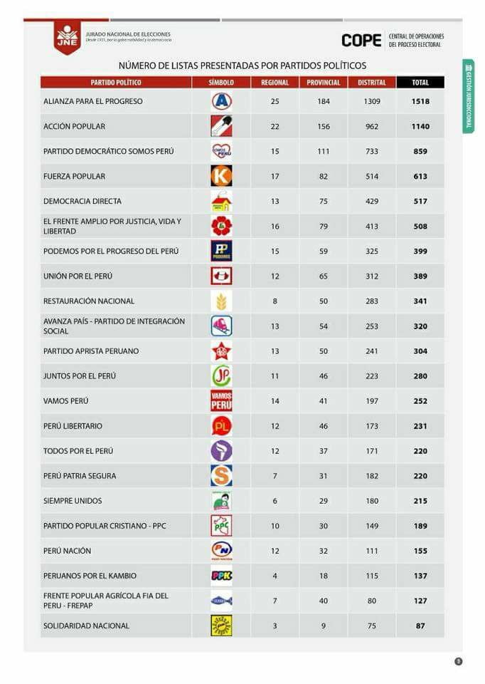 La lista de los últimos la completa el Frente Popular Agrícola FIA del Perú (FREPAP) y Solidaridad Nacional, con 127 y 87 candidatos respectivamente.