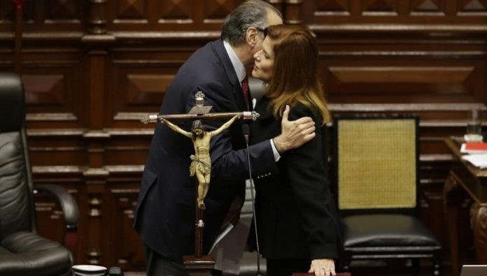 Mercedes Aráoz fue recibida con aplausos por parte de los legisladores quienes coreaban «¡Perú!, ¡Perú! cuando ingresó al Hemiciclo y se ubicó al lado del presidente del Congreso, Pedro Olaechea, quien le confió el cargo.