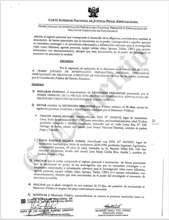 La medida coercitiva fue dictada por la jueza María Álvarez, de la Corte Superior de Justicia Penal Especalizada. La orden de detención preliminar también incluye a Enrique Salazar Torres, exgerente del Proyecto Especial Olmos Tinajones y hombre de confianza de Simon.