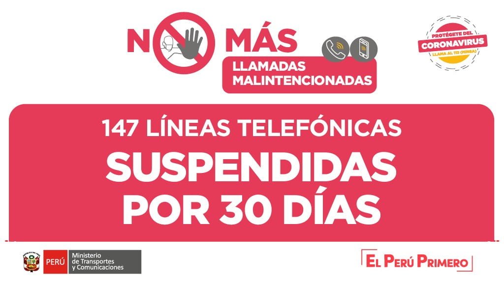 En pleno Estado de Emergencia Nacional por el coronavirus, las llamadas malintencionadas a las centrales de urgencias e información siguen en aumento. El presidente de la República, Martín Vizcarra, informó que, hasta el día de hoy, 147 líneas telefónicas, con sus planes de datos de internet, fueron suspendidas por incurrir en esta falta.