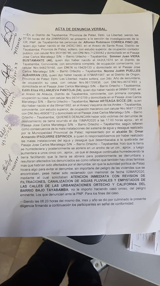 Según el representante de las familias damnificadas, Alfonso Robinson Correa Pino (26), ellos comunicaron del problema de filtración de agua al alcalde de Pataz, a través de un memorial, presentado el 2 de marzo pasado, sin embargo, no se tomaron las medidas correctivas para solucionar las rajaduras del terreno. En el documento le pedían la atención inmediata con la revisión de filtraciones, canalización de aguas fluviales y empistado de las calles de las urbanizaciones Ortecho y California del barrio bajo de Tayabamba.