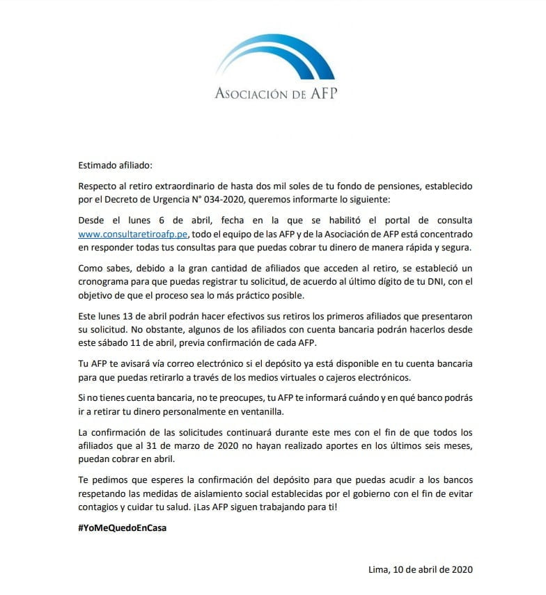 Como se recuerda, desde el lunes 6 de abril, fecha en la que se habilitó el portal de consulta www.consultaretiroafp.pe, todo el equipo de las AFP y de la Asociación de AFP está concentrado en responder las consultas para que los cobros se hagan de manera rápida y segura.