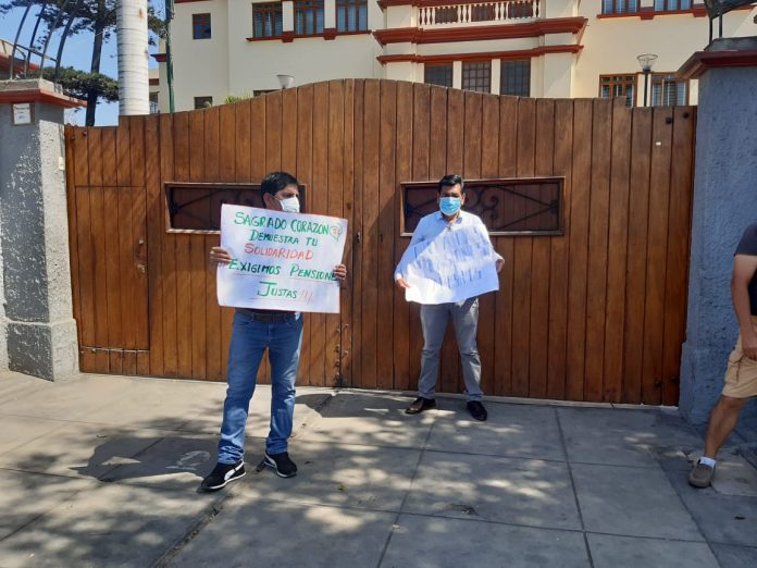 Los padres de familia del colegio parroquial Sagrado Corazón, hicieron un plantón de protesta en los exteriores del centro educativo, reclamando pensiones justas pues afirman que de los 300 soles mensuales, sólo les descontaron 30.