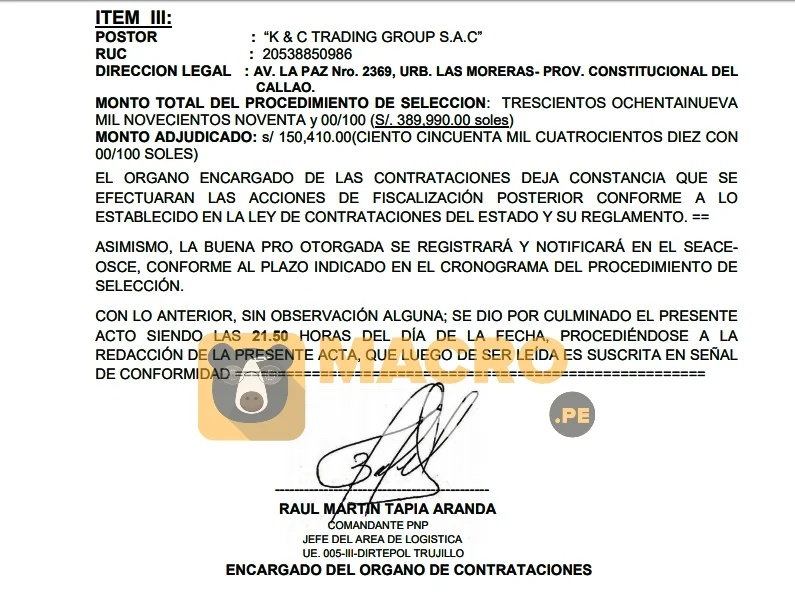El comandante Raúl Martín Tapia Aranda, es el jefe del Área de Logística de la Unidad Ejecutora 005-III-Dirtepol Trujillo y encargado del Órgano de Contrataciones de esta MACREPOL. Según los documentos a los que hemos podido acceder de forma exclusiva, el oficial se encargaba de entregar la buena pro a los procesos de contratación directa realizados en el marco de la emergencia nacional por Covid-19.