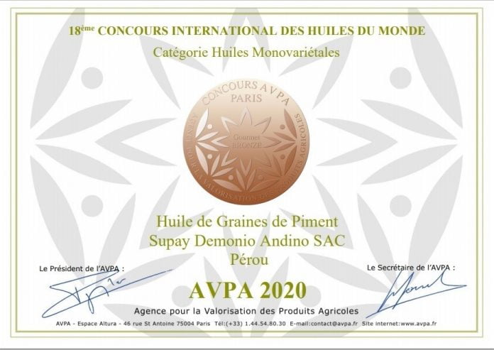 La marca de aceites vegetales Supay, cuya empresa productora forma parte de la Ruta Exportadora, obtuvo la medalla gourmet bronce de los premios AVPA Paris 2020, informó la Comisión de Promoción del Perú para la Exportación y el Turismo (PROMPERÚ).