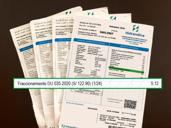 La empresa Hidrandina informó que la aplicación del fraccionamiento de deuda, como facilidad de pago para algunos clientes, obedece a los Decreto de Urgencia 035-2020, 074-2020 y 062-2020, esto se realiza de forma automática en los recibos de los beneficiarios.
