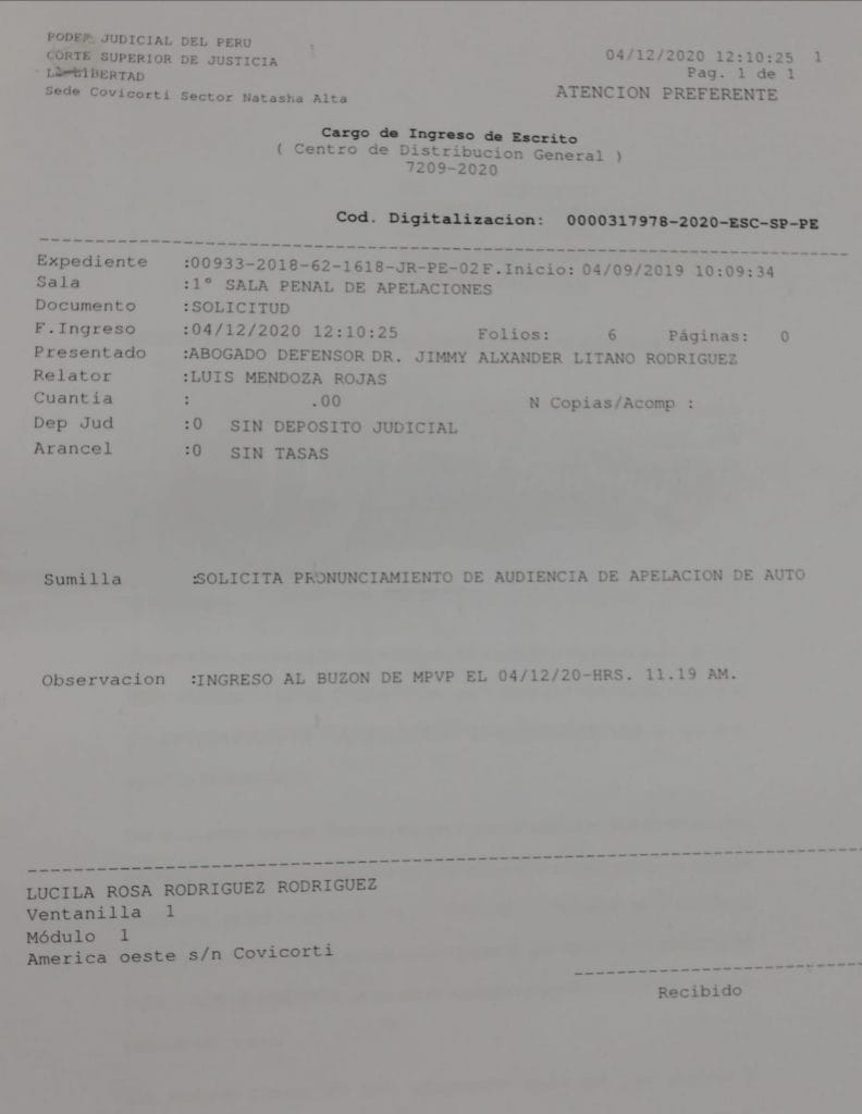 Llama la atención que en la hoja de cargo de ingreso de dichos documentos aparece el rótulo de «Atención Preferente», lo que significa que la apelación del abogado Jimmy Alexander Litano Rodríguez contra la sentencia en primera instancia en contra de la exautoridad edil será vista con prioridad.