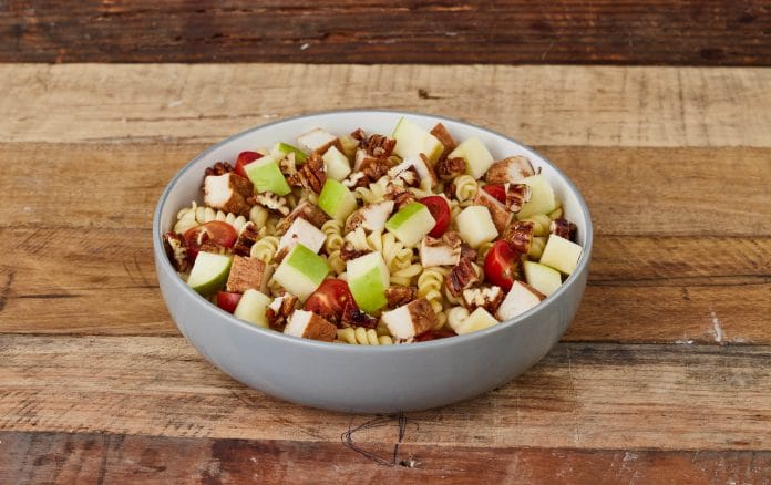 5. Colocar los fideos en un bowl grande e ir agregando los ingredientes cortados previamente: los tomates, las pecanas, las manzanas y el pavo. Agregar el aliño de yogurt y mezclar. Servir.