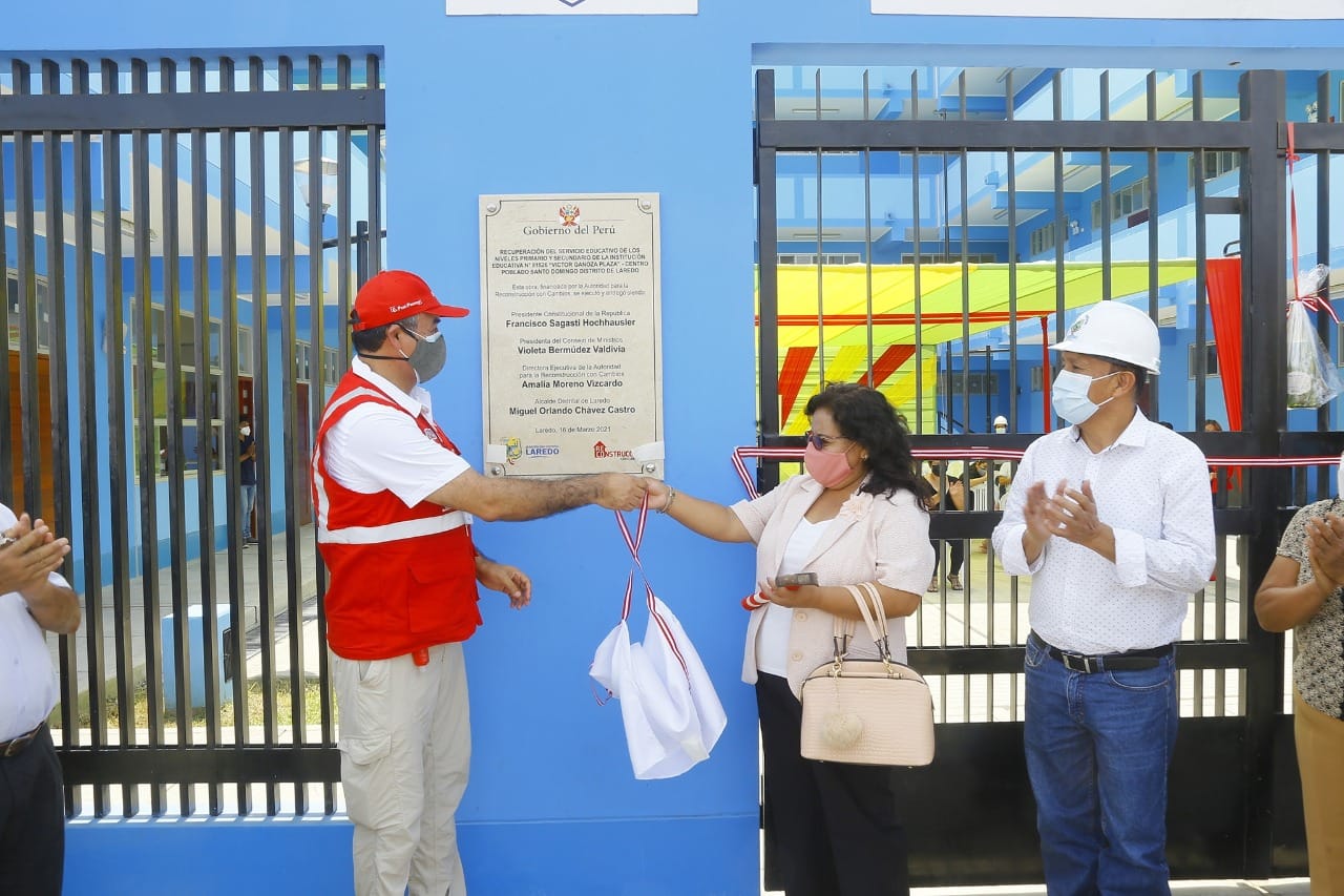 La Municipalidad Distrital de Laredo inauguró la Institución Educativa “Víctor Ganoza Plaza” en el centro poblado “Santo Domingo”, cuya reconstrucción requirió una inversión de más de 5 millones de soles y contribuirá a brindar un servicio educativo de calidad, a cerca de 250 alumnos, que podrán acceder a modernas instalaciones.