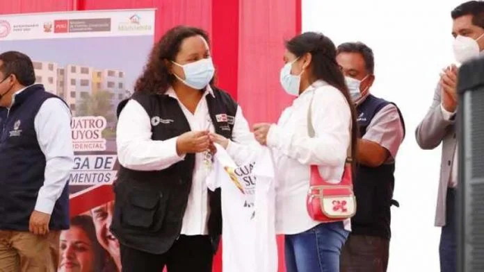 La ministra de Vivienda, Construcción y Saneamiento, Solangel Fernández, participó en la entrega simbólica de 180 viviendas para familias damnificadas por el fenómeno del Niño Costero, las cuales son parte del proyecto “Cuatro Suyos”, en el distrito de La Esperanza, y a las cuales han accedido gracias al Bono Familiar Habitacional del programa Techo Propio.