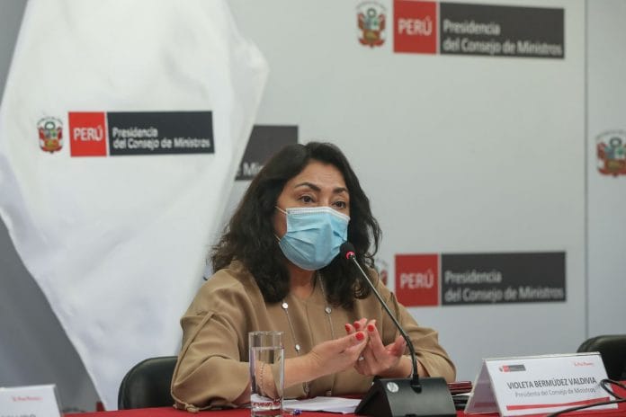 Violeta Bermúdez estuvo acompañada del ministro Salud, Óscar Ugarte, quien insistió a la población acercarse a los vacunatorios en las fechas indicadas según el portal web ‘Pongo el hombro’ y así evitar aglomeraciones.
