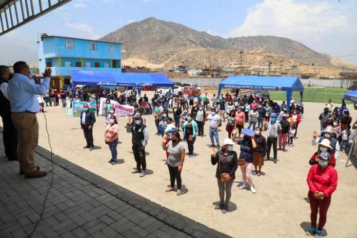 “Estamos trabajando en los diferentes barrios. Habíamos planificado la titulación de 30 mil viviendas, pero me informan que tenemos que incluir la VI Etapa de Víctor Raúl, la III Etapa de Túpac Amaru. Nadie debe quedar fuera (…) Vecinos, nos tienen que ayudar. No estamos cobrando ni un sol. Estamos trabajando en conjunto con el municipio de El Porvenir”, explicó Ruiz Vega.