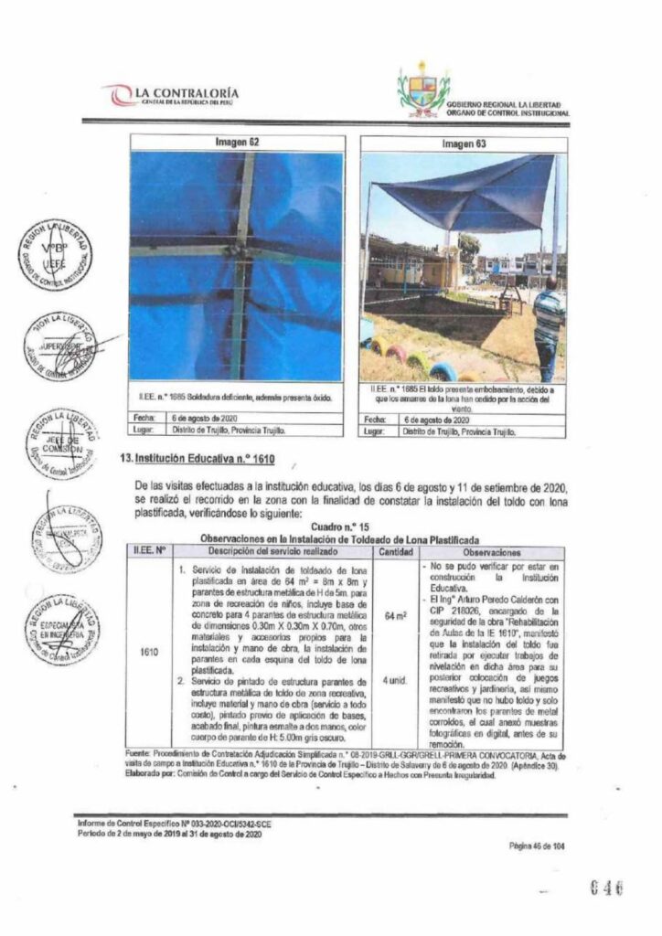 El pasado 05 de octubre, la Contraloría General de la República notificó al gobernador regional Manuel Llempén, el Informe de Control N° 021-2021-OCI/5342-SOO, en el que alertó que han pasado más de 11 meses sin que la Secretaría Técnica de la Gerencia Regional de Educación de La Libertad haya emitido el informe de precalificación correspondiente sobra la presunta responsabilidad administrativa de 5 servidores de la Gerencia Regional de Educación de La Libertad (GRELL), involucrados en el perjuicio económico de 182 mil soles que se ocasionó en la servicio de mantenimiento de infraestructura de patios y exteriores de los colegios de Trujillo y Ascope, obra que se ejecutó a finales de 2019 e inicios de 2020 y que la Contraloría observó en el Informe de Control Especifico N° 033-2020-2-5342-SCE, documento publicado y enviado al Gobierno Regional de La Libertad, el 29 octubre del año pasado.
