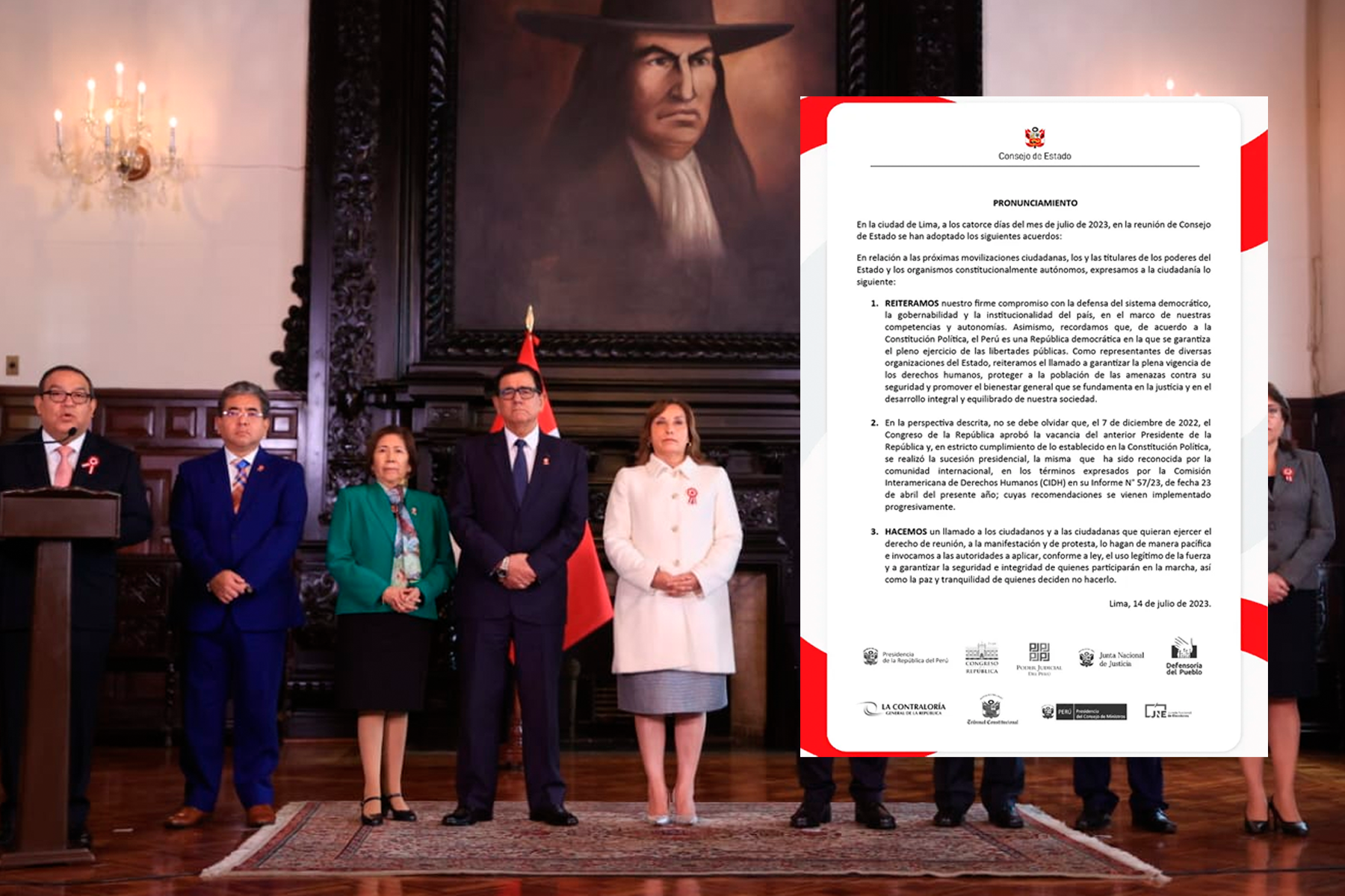 Es de señalar que, en la sesión de Consejo de Estado de este viernes participaron la presidenta Boluarte; los titulares del Congreso, José Williams; del Poder Judicial, Javier Arévalo; del Tribunal Constitucional (TC), Francisco Morales; el contralor general de la Nación, Nelson Shack.