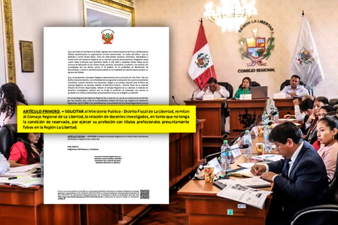 El Consejo Regional de La Libertad aprobó solicitar al Ministerio Publico – Distrito Fiscal de La Libertad, les remita la relación de docentes investigados, en tanto que no tenga la condición de reservada, por ejercer su profesión con títulos profesionales presuntamente falsos en la región La Libertad.