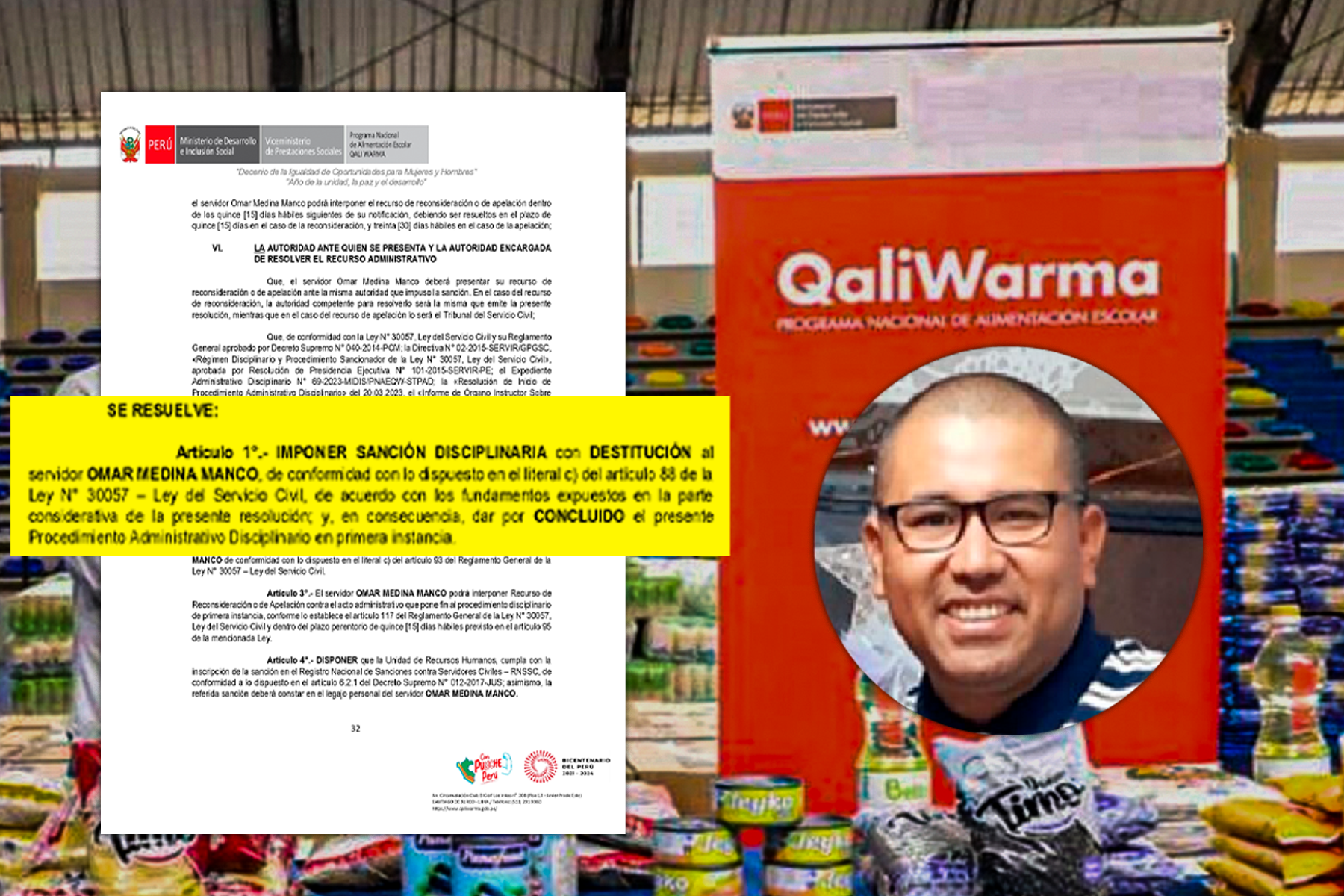 El pasado 7 de julio de este año, el Programa de Alimentación Escolar Qali Warma publicó la resolución de sanción del Procedimiento Administrativo Disciplinario (PAD) entablado al exfuncionario nacional Omar Medina Manco, quien se desempeñó como Coordinador de la Unidad de Gestión de Contrataciones y Transferencia de Recursos (UGCTR).