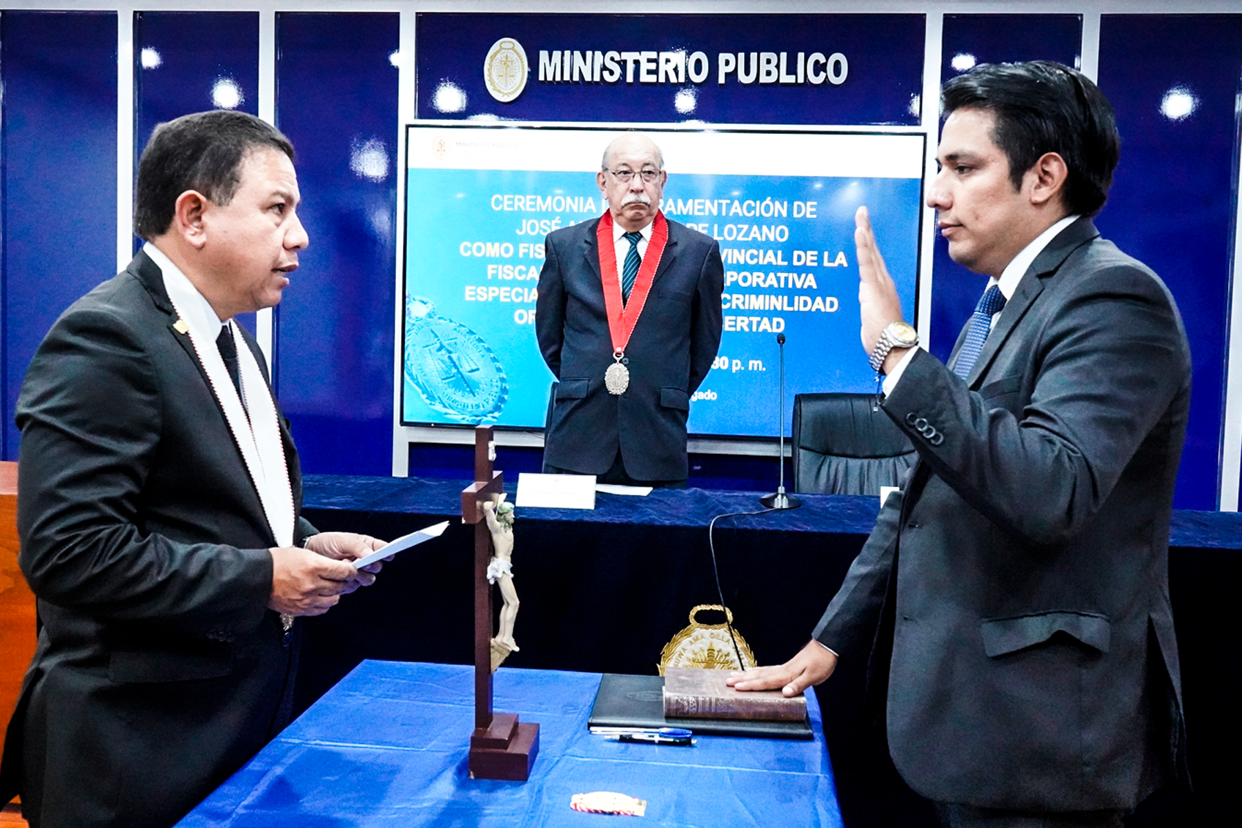 En ceremonia protocolar, el fiscal provincial Manuel Humberto Utano Zevallos, presidente de la Junta de Fiscales Provinciales del Distrito Fiscal de La Libertad tomó juramento al nuevo fiscal contra la Criminalidad Organizada de La Libertad, José Andrés Quispe Lozano.