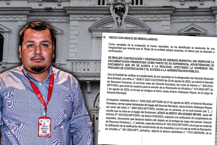 Se trata del gerente municipal de la comuna trujillana, Jesús Velásquez Reyna, quien según la Contraloría General de la República en su Informe de Acción de Oficio Posterior N°050-2023-CG/OCI0424-AO, advirtió que no cumple con el perfil requerido para ocupar el mencionado cargo.