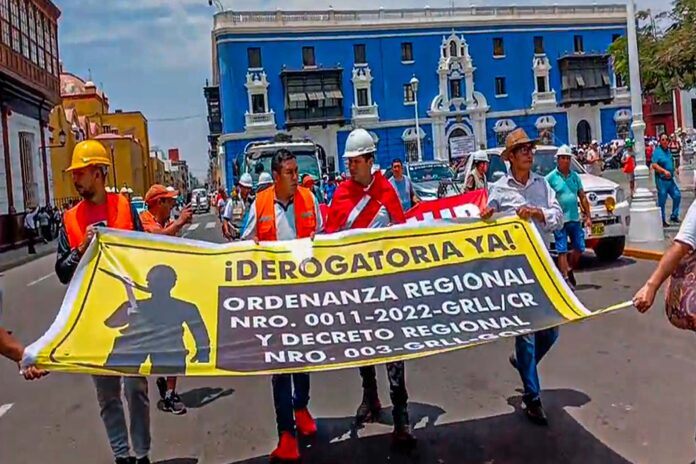 Un grupo de mineros protestaron frente a las oficinas del Gobierno Regional La Libertad exigiendo la derogación de la Ordenanza Regional N°011-2022-GRLL, que entrará en vigencia este 14 de noviembre, que permitirá la fiscalización del transporte de mineral.