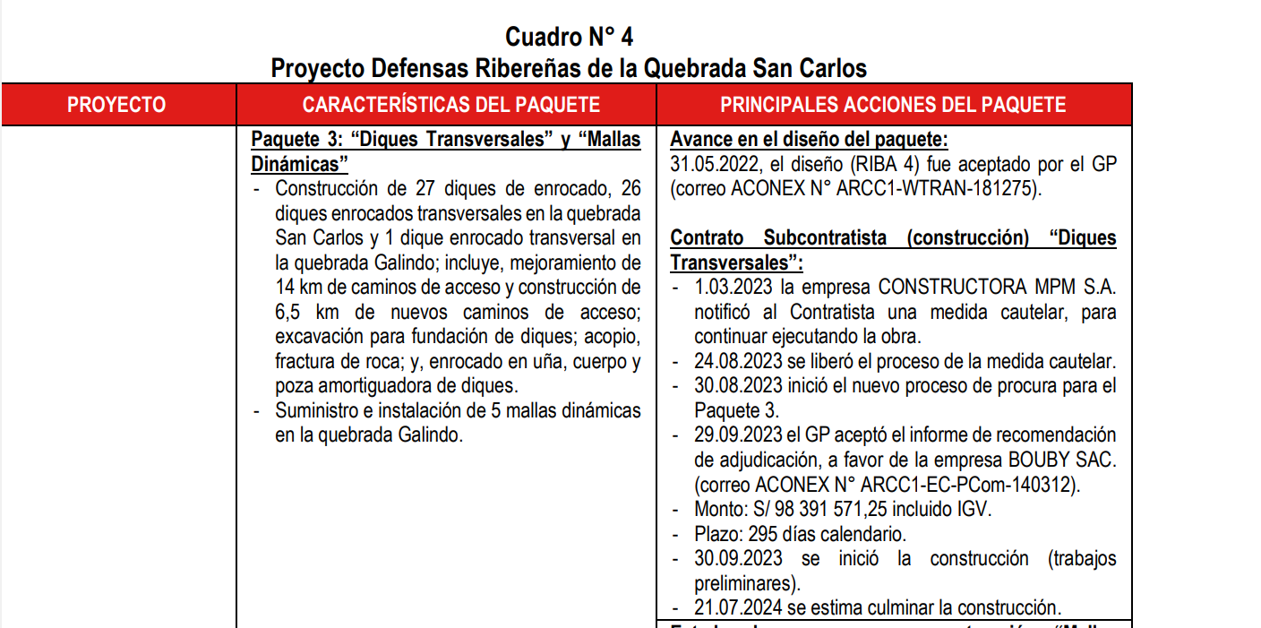 Como se ha informado, el Paquete 3 – Diques Transversales de la Quebrada San Carlos se adjudicó inicialmente a la empresa MPM S.A. Posteriormente, el pasado 31 de enero de 2023, el consorcio Besalco Stracon comunicó al gerente del proyecto la resolución del subcontrato con la señalada empresa. En agosto de este año se convocó a una licitación express, en la que se decidió invitar a los postores que habían participado en la licitación anterior, que había ganado MPM S.A., «puesto que ya conocían los documentos de diseño (expediente técnico)». El resultado jugó a favor de la empresa BOUBY SAC.