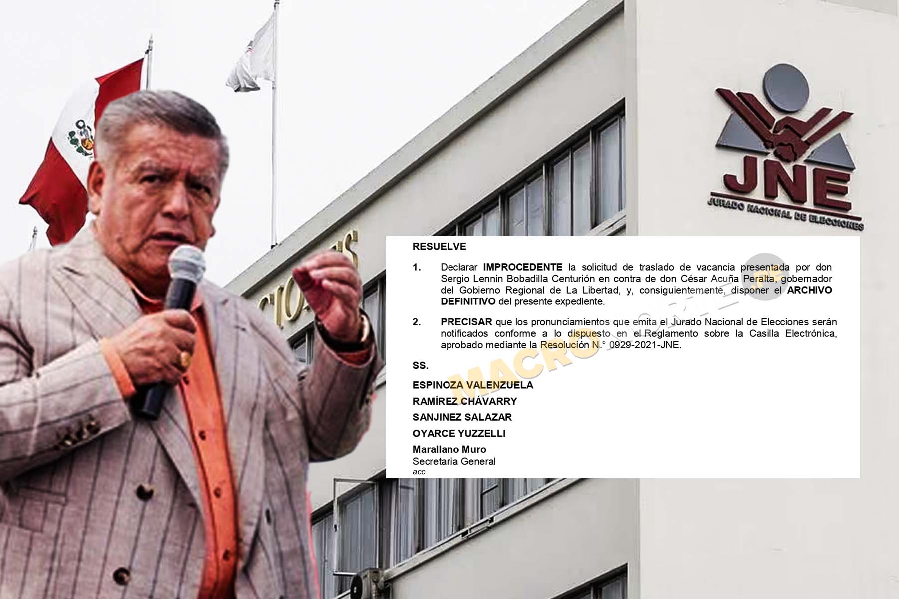 Mediante expediente N° JNE.2023002978, el Jurado Nacional de Elecciones (JNE) declaró improcedente la solicitud de vacancia presentada contra el gobernador regional de La Libertad, César Acuña, y dispuso el archivo definitivo del expediente.