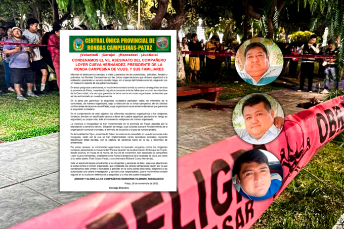“Este vil asesinato busca amedrentar a los dirigentes y personas de bien, para que abandonen la lucha contra el crimen organizado, que encabeza las rondas campesinas; razón por la que condenamos este crimen y llamamos a persistir en la lucha contra esta lacra; exigiendo a las autoridades una célere investigación y sanción a los responsables; que el movimiento rondero seguirá en su lucha en defensa de la seguridad y la vida del pueblo trabajador”, indica el documento.