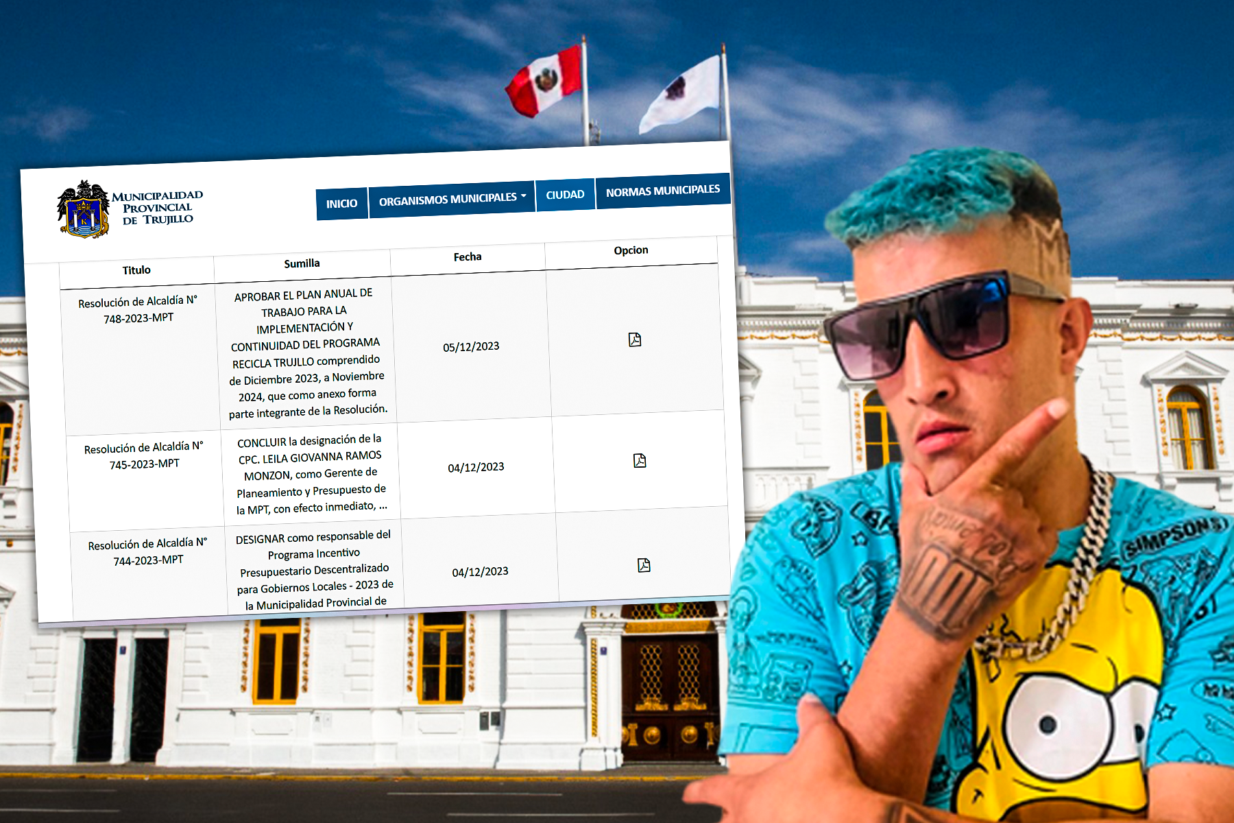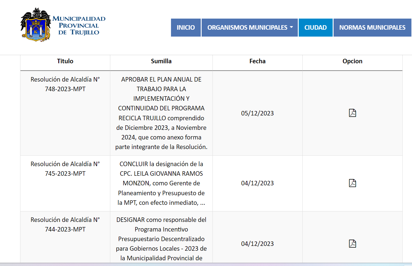 Como se puede observar en la captura de pantalla, el registro de normas publicadas por la MPT muestra que de la Resolución de Alcaldía N° 745-2023-MPT, cuyo contenido es la destitución de la gerente de Planeamiento y Presupuesto de la MPT, se da un salto hasta la Resolución de Alcaldía N° 748-2023-MPT, emitida para aprobar el plan anual de trabajo para la implementación del Programa Recicla Trujillo. Fuentes internas de la MPT señalan que se habría dado la orden de retirar estas resoluciones, tras desatarse el escandalo por el nombramiento de «Makanaky». Actualmente los documentos no están disponibles para consulta pública.