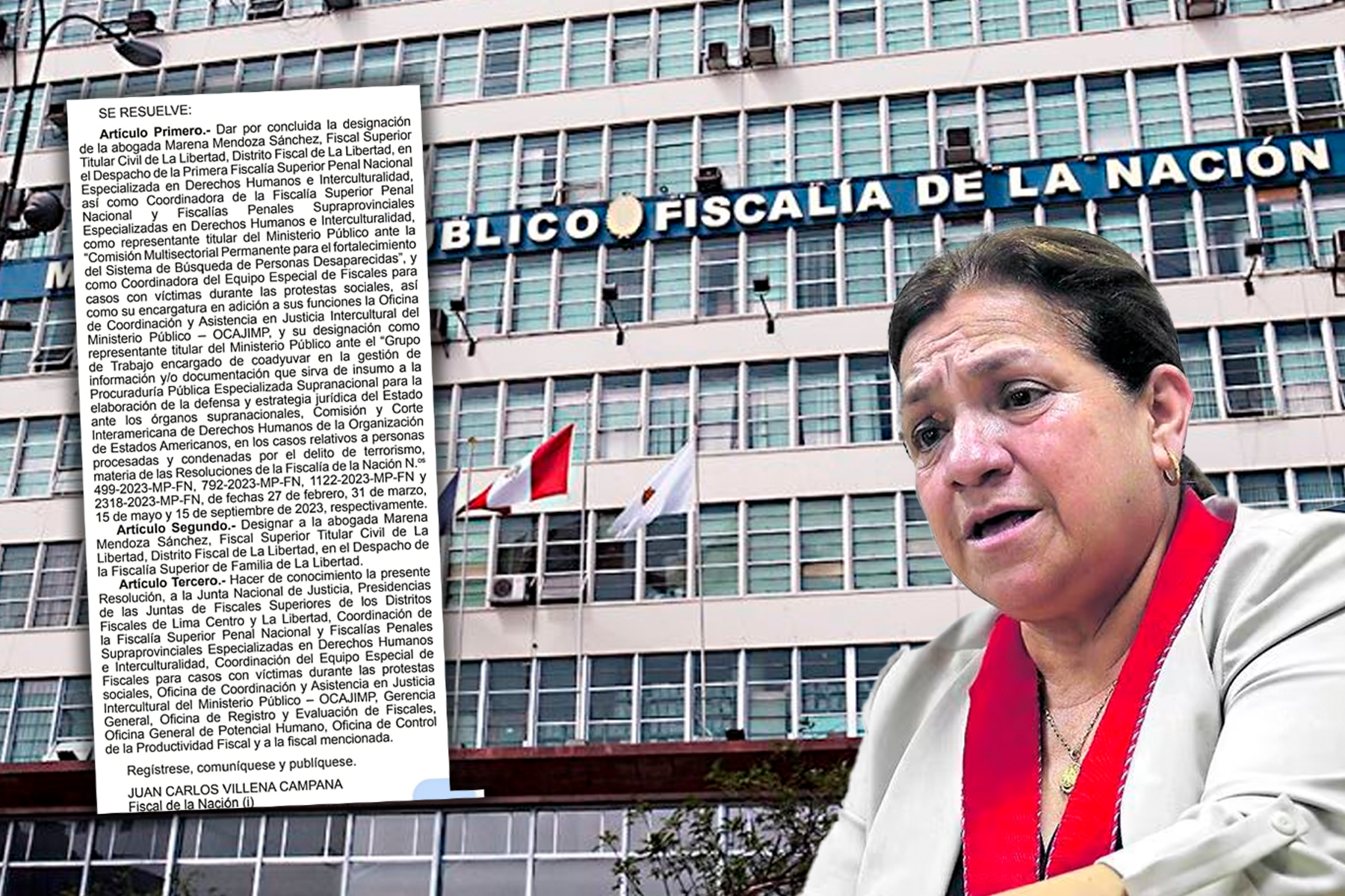 “Dar por concluida la designación de la abogada Marena Mendoza Sánchez, Fiscal Superior Titular Civil de La Libertad, Distrito Fiscal de La Libertad, en el Despacho de la Primera Fiscalía Superior Penal Nacional Especializada en Derechos Humanos e Interculturalidad, así como Coordinadora de la Fiscalía Superior Penal Nacional y Fiscalías Penales Supraprovinciales Especializadas en Derechos Humanos e Interculturalidad”, indica el documento.