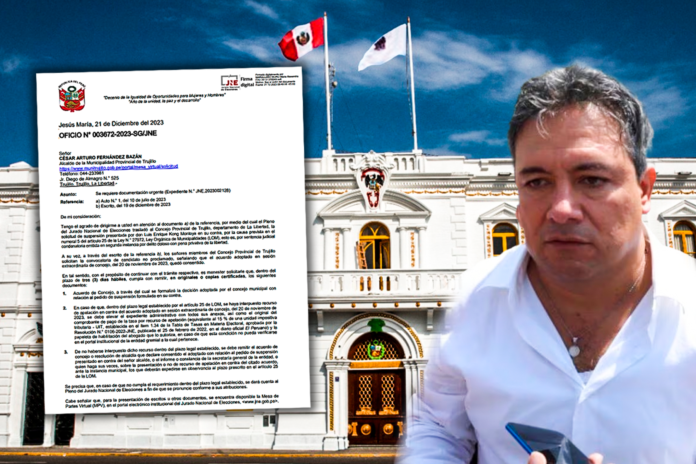 El Jurado Nacional de Elecciones (JNE), mediante Oficios N°003672-2023-SG/JNE, N°003673-2023-SG/JNE y N°003674-2023-SG/JNE, solicitó al alcalde de Trujillo, regidores del Concejo provincial de Trujillo y gerente municipal de la comuna provincial, remitir el Acuerdo de Concejo donde se ratificó la suspensión del cuestionado burgomaestre Arturo Fernández Bazán.