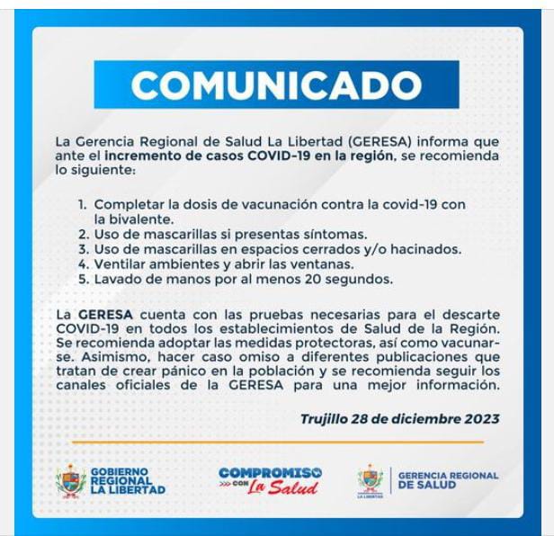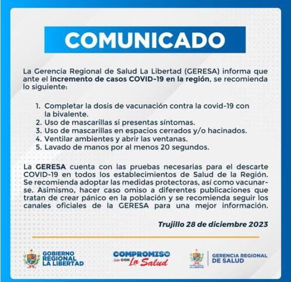 Ante el incremento de casos de la Covid-19, la Gerencia Regional de Salud (Geresa) La Libertad ha solicitado a la población liberteña a cumplir las siguientes recomendaciones.