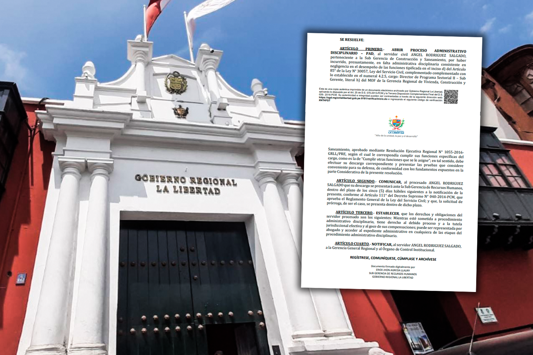 De acuerdo a lo estipulado en la Resolución Sub Gerencial N° 000407-2023-GRLL-GGR-GRA-SGRH, que lleva la firma de Erick Jhon Agreda Llaury, subgerente de Recursos Humanos; señala que Ángel Rodríguez, otorgó conformidad al entregable de 152 sistemas de agua en las provincias de la región La Libertad, lo que generó el pago total a favor de la empresa contratista Grupo Mundo, pese a que un informe emitido por el propio servidor, se consignaba un faltante de 15 sistemas de agua.