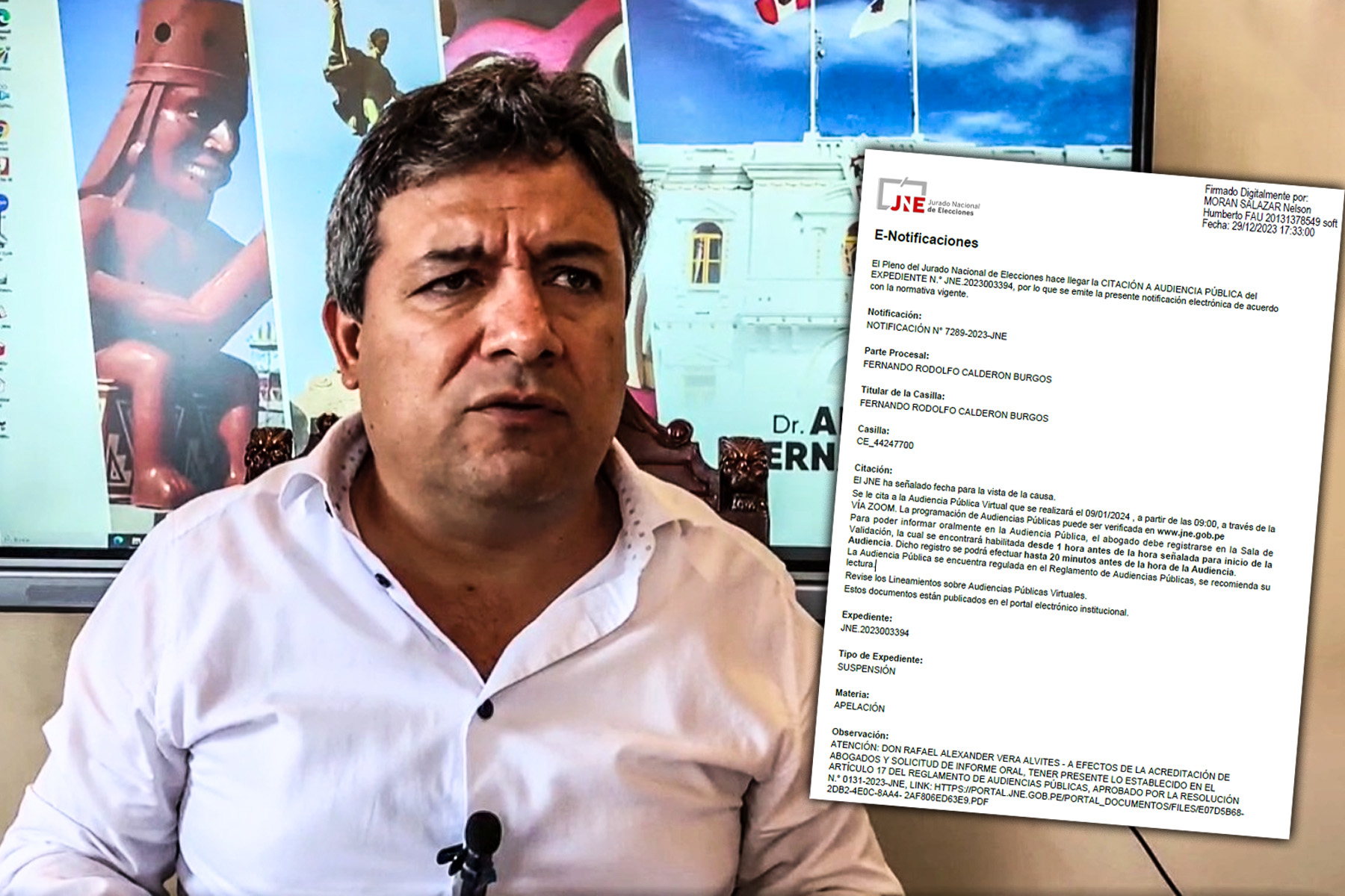“Se le cita a la Audiencia Pública Virtual que se realizará el 09/01/2024, a partir de las 09:00, a través de la vía zoom. La programación de Audiencias Públicas puede ser verificada en www.jne.gob.pe Para poder informar oralmente en la Audiencia Pública, el abogado debe registrarse en la Sala de Validación, la cual se encontrará habilitada desde 1 hora antes de la hora señalada para inicio de la Audiencia. Dicho registro se podrá efectuar hasta 20 minutos antes de la hora de la Audiencia. La Audiencia Pública se encuentra regulada en el Reglamento de Audiencias Públicas, se recomienda su lectura”, se lee en la notificación del JNE.